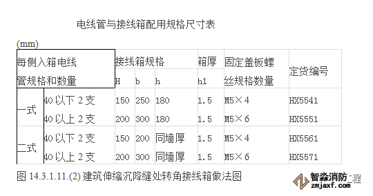 管路在通過建筑物的變形縫時,應加裝管路補償裝置。管路補償裝置是在變形縫的兩側對稱預埋一個接線盒,用一根短管將兩接線盒相鄰面連接起來,短管的一端與一個盒子固定牢固,另一端伸入另一盒內,且此盒上的相應位置的孔要開長孔,長孔的長度不小于管徑的2倍。如果該補償裝置在同一軸線墻體上,則可有拐角箱作為補償裝置,如不在同一軸線上則可用直筒式接線箱進行補償。做法可參照圖143111?(1)?(2)。也可采用防水型可撓金屬電線管跨越兩側接線箱盒并留有適當余量。