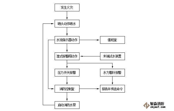 2、 當(dāng)發(fā)生火災(zāi)時,灑水噴頭的感溫元件會自動脫落,并開始向保護(hù)區(qū)灑水,由于系統(tǒng)內(nèi)的水由原來的相對靜止?fàn)顟B(tài),變?yōu)榱鲃訝顟B(tài),水流指示器感應(yīng)并送出信號。接著濕式報警閥開啟閥片,壓力開關(guān)感應(yīng)送出信號,水力警鈴跟著報警,根據(jù)水流指示器和壓力開關(guān)的信號,控制器啟動消防水泵,向管網(wǎng)回壓供水,達(dá)到持續(xù)自動噴水滅火的作用。工作原理圖如圖: