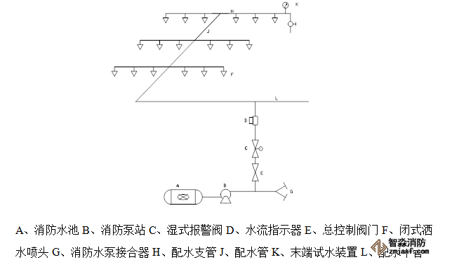 自動噴水滅火系統(tǒng)由水源、加壓送水、報警閥、管網(wǎng)噴頭以及火災(zāi)探測系統(tǒng)等組成。本自動噴水滅火系統(tǒng)屬于濕式自動噴水滅火系統(tǒng)。其結(jié)構(gòu)如下圖: