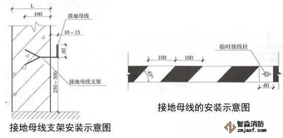 2、配電室接地母線:用扁鋼制作接地母線支架,支架末端加工成燕尾形,埋設(shè)深度不小于50mm,出墻平直長(zhǎng)度為10~15mm,上彎立面長(zhǎng)度為40mm。支架安裝間距為1m,離地面高度為300mm。接地母線應(yīng)先調(diào)直或煨彎后焊接在支架上,接地母線搭接長(zhǎng)度大于等于扁鋼寬度的2倍且三面施焊。每房間設(shè)不小于2處的蝴蝶螺母作為臨時(shí)接線柱,過(guò)門(mén)處暗敷埋設(shè),轉(zhuǎn)角用扁鐵煨制圓弧形,煨彎半徑R≥100mm,穿墻板處加設(shè)套管保護(hù)。接地母線應(yīng)刷45°斜向黃綠相間標(biāo)識(shí)油漆,條紋間距100mm,臨時(shí)接線柱兩側(cè)各留20mm寬度不刷漆。