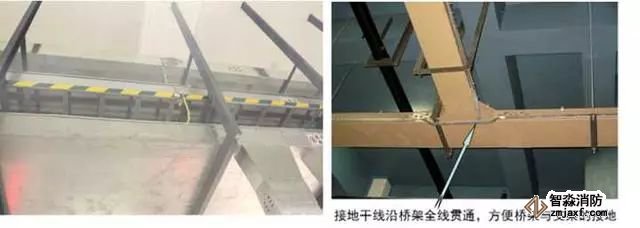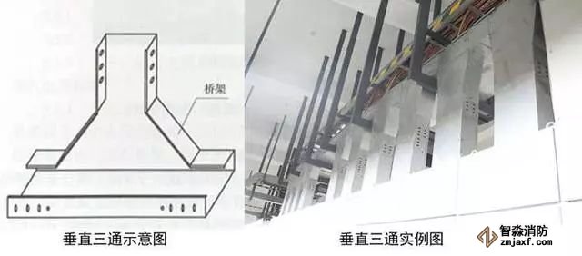 2、橋架三通安裝:根據(jù)電纜橋架走向,按照最大電纜直徑的10~15倍選擇三通形式和彎曲半徑。在距三通接口500mm處設(shè)置支架,橋架寬度大于800mm時(shí),應(yīng)在三通底部增加支架。兩段橋架與橋架、橋架與支架之間跨接接地。