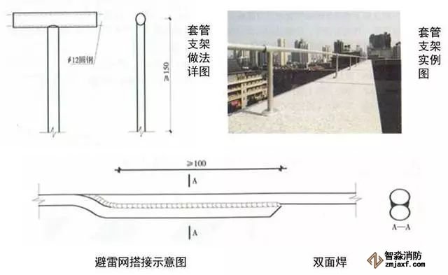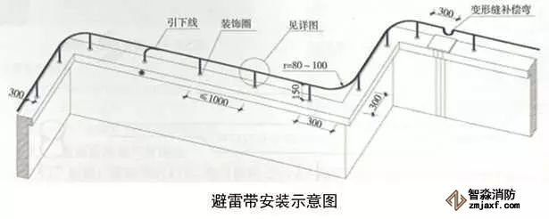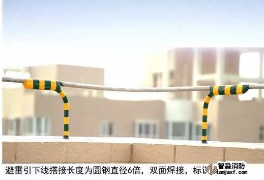 3、圓鋼避雷帶敷設(shè):按設(shè)計(jì)位置彈線、定位,一般情況下,避雷帶應(yīng)居女兒墻(屋脊)中心,當(dāng)女兒墻寬度大于300mm時(shí),支架布設(shè)于距外沿150mm處,距變形縫、轉(zhuǎn)彎300mm處設(shè)支架,直線段支架均勻分布,間距不大于1m;支架埋深不小于80mm,出女兒墻頂面不小于150mm,調(diào)整、校正支架的垂直度,根部套不銹鋼裝飾圈并用耐候膠密封固定。圓鋼調(diào)直后敷設(shè)在支架上,轉(zhuǎn)彎、搭接、變形縫處圓鋼煨彎加工,轉(zhuǎn)彎處?kù)袕澃霃綖?0~100mm,搭接處一端鋼筋煨乙字彎,與另一端圓鋼上下搭接,搭接長(zhǎng)度為100mm,搭接點(diǎn)宜設(shè)在離支架不小于200mm位置處,雙面施焊,焊縫連接飽滿,焊渣清理干凈,焊接點(diǎn)應(yīng)先刷防銹漆,再刷銀粉漆,防腐處理到位;變形縫處鋼筋煨成向下半圓形。將防雷引下線可靠焊接在避雷帶上。拉通線校正避雷帶的高度、平直度。