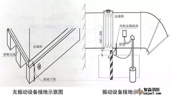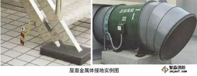6、屋面金屬體接地:用-25x4的鍍鋅扁鋼從就近的避雷網(wǎng)引接地線,接地扁鋼一端與避雷網(wǎng)連接,另一端在金屬體附近地面引出,應(yīng)高于設(shè)備基礎(chǔ)100~200mm。無(wú)振動(dòng)設(shè)備在金屬體上直接焊接,有震動(dòng)設(shè)備和非碳鋼金屬體應(yīng)用編織軟銅線兩端壓端子跨接,編織軟銅線外套黃綠雙色熱縮套且熱縮。伸出地面的接地母線應(yīng)刷黃綠相間油漆。體積較大的金屬體應(yīng)做不小于2處的接地,高度高于避雷網(wǎng)時(shí),應(yīng)加避雷針保護(hù)。接地母線附近應(yīng)做接地標(biāo)識(shí)。