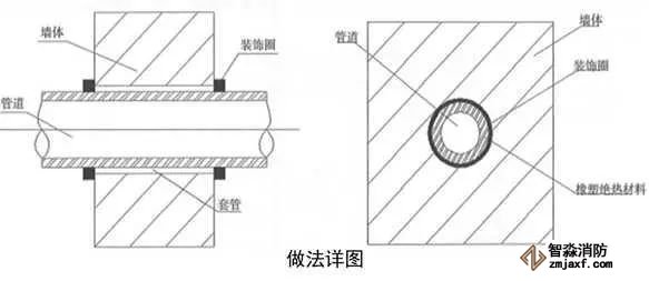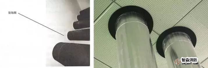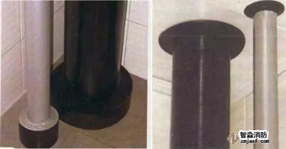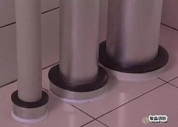 管道穿樓板處根部應(yīng)設(shè)套管或護(hù)墩,套管與管道之間應(yīng)做防火封堵,頂部齊平光滑,設(shè)裝飾圈。