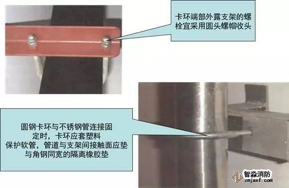 選擇與管徑匹配的卡環(huán),卡環(huán)安裝固定螺栓孔應(yīng)保證管道順直且居卡環(huán)中間,卡環(huán)與管道應(yīng)接觸緊密。圓鋼卡環(huán)與不銹鋼管、銅管連接固定時(shí),卡環(huán)應(yīng)套塑料保護(hù)軟管,管道與支架間接觸面應(yīng)墊與角鋼同寬的隔離橡膠墊。扁鋼卡環(huán)應(yīng)與木托同寬,與螺栓應(yīng)滿焊連接;在與支架連接處應(yīng)垂直,扁鋼端部與支架宜留有5~8mm收縮余量,卡環(huán)端部外露支架的螺栓宜采用圓頭螺帽收頭,油漆涂刷應(yīng)均勻。