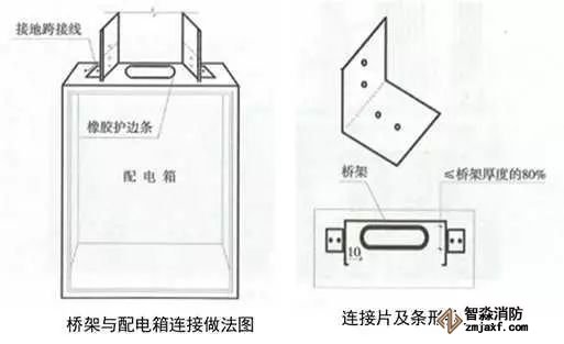 3、橋架與配電箱的連接:配電箱頂部劃線、鉆孔,用電鋸開(kāi)條形孔,清理孔邊沿毛刺,孔兩端為弧形,兩端尺寸小于橋架寬度10mm左右,厚度小于等于橋架厚度的80%,孔中心與橋架中心對(duì)應(yīng),開(kāi)孔處補(bǔ)漆,孔周邊粘貼橡膠條護(hù)口。箱體與橋架用1~1.5mm厚、90°的橋架連接片連接,連接螺栓絲頭朝外,加設(shè)專用墊片,刃面朝向橋架連接片,螺栓外露2~3扣絲。橋架與箱體采用4mm²黃綠雙色多股軟銅線或編織軟銅線接地跨接。
