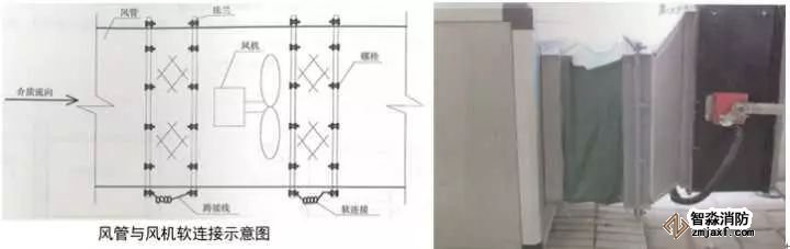 3、風(fēng)管與風(fēng)機(jī)軟連接:確定風(fēng)管與風(fēng)機(jī)之間的距離和同心性,距離要求150~200mm,風(fēng)管、風(fēng)機(jī)同心徑;制作軟接兩端法蘭,中低壓系統(tǒng)法蘭螺栓孔間距120~150mm,高壓及凈化系統(tǒng)距80~100mm,軟接長(zhǎng)度為法蘭間距加20~30mm伸縮量,用鉚釘將軟接均勻平整的固定在法蘭上,鉚釘位置和法蘭螺栓位置對(duì)應(yīng),風(fēng)機(jī)法蘭與風(fēng)管法蘭螺栓孔對(duì)應(yīng),螺栓朝向與介質(zhì)流向一致,螺栓外露長(zhǎng)度為2~3扣絲。屋面與防暴場(chǎng)所采用不小于4mm²的黃綠雙色銅芯軟線壓接銅鼻子接地跨接。成排風(fēng)機(jī)中心線應(yīng)在一條線上。