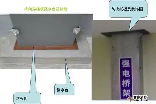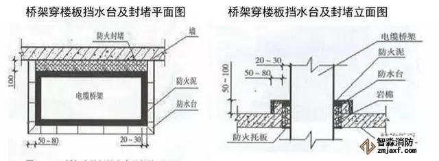 5)電井應(yīng)設(shè)門(mén)檻,橋架、插接母線在地面或穿樓板處有不低于50mm的擋水臺(tái),橋架、插接母線穿樓板處應(yīng)做20~30mm防火封堵,頂部設(shè)置防火托板,加裝飾圈。