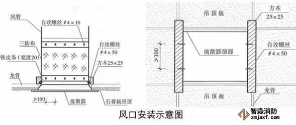 根據(jù)策劃后的圖紙,確定風(fēng)口位置,在風(fēng)口頸部用手槍鉆打眼,孔徑4mm,打眼間距不大于100mm,用自攻絲和1.5~2.0mm厚的金屬條將三防布固定到風(fēng)口頸部。方木防火防腐處理后固定在吊頂龍骨上,用自攻絲將風(fēng)口固定在方木上,自攻絲間距不大于300mm,校正風(fēng)口,與吊頂結(jié)合嚴(yán)密。