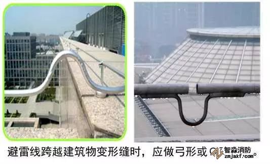 屋頂設(shè)置避雷針或避雷線,主要作用是對(duì)建筑物和屋面設(shè)備起到保護(hù)作用。其質(zhì)量控制主要為:屋面的設(shè)備、金屬構(gòu)件、金屬管道、金屬支架、電氣設(shè)備金屬外殼都必須和接地干線可靠連接。避雷線安裝應(yīng)平直,鍍鋅層完好,接頭應(yīng)采用雙面焊接,圓鋼搭接長(zhǎng)度6倍直徑,焊接焊口須防腐處理。引下線宜采用圓鋼或扁鋼。當(dāng)采用圓鋼時(shí),直徑不應(yīng)小于8mm。當(dāng)采用扁鋼時(shí),截面不應(yīng)小于48mm2,厚度不應(yīng)小于4mm。對(duì)于裝設(shè)在煙囪上的引下線,圓鋼直徑不應(yīng)小于12mm。扁鋼截面不應(yīng)小于100mm2且厚度不應(yīng)小于4mm。避雷帶跨越建筑物變形縫時(shí),應(yīng)設(shè)補(bǔ)償裝置。接閃器應(yīng)熱鍍鋅,焊接處應(yīng)涂防腐漆。在腐蝕性較強(qiáng)的場(chǎng)所,還應(yīng)加大其截面或采取其他防腐措施。