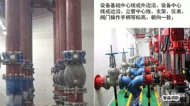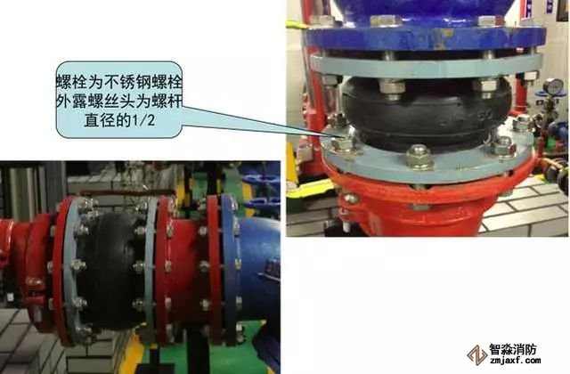3、水泵吸水、出水變徑管安裝質(zhì)量控制要點(diǎn):水泵吸水口安裝上平偏心大小頭,出水口安裝同心大小頭,螺栓外露長(zhǎng)度不大于螺桿直徑的1/2,且長(zhǎng)度一致。