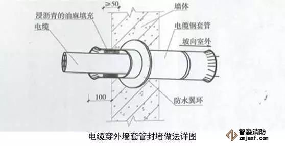 2、電源管穿外墻做法:在穿外墻位置敷設(shè)套管,宜內(nèi)高外低并設(shè)止水翼環(huán),管徑為電纜外徑的2倍,長(zhǎng)度為每邊出墻面100mm。有散水時(shí)應(yīng)伸出散水外邊沿100mm,套管兩端制作喇叭口,內(nèi)壁刷防銹漆,外壁出墻刷瀝青漆。電纜穿入套管后,兩端嵌入瀝青麻絲,瀝青麻絲在套管內(nèi)填充密實(shí),距管口深度大于50mm,并應(yīng)使電纜在套管內(nèi)居中。