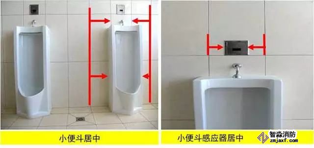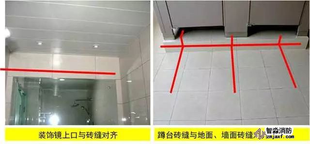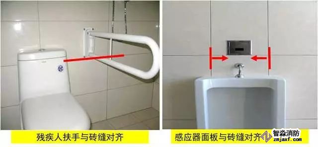 質(zhì)量控制要點(diǎn):器具、排水管、配件等與墻、地面磚居中、對(duì)縫,周邊打膠光滑密實(shí)。成排器具安裝應(yīng)排列整齊,高度一致,間距均勻。