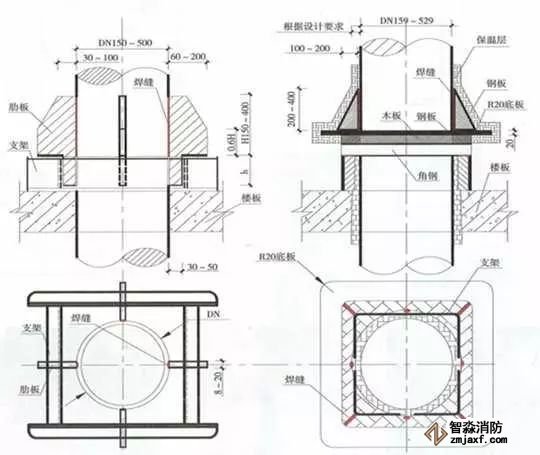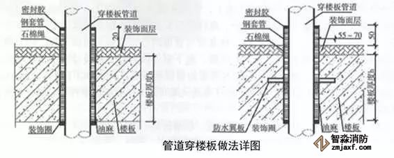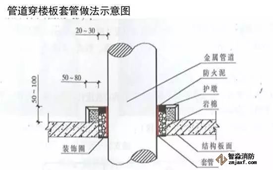 當(dāng)管道穿過(guò)防火堤、防火墻、樓板時(shí),應(yīng)安裝套管。穿防火堤和防火墻的套管長(zhǎng)度不應(yīng)小于防火堤和防火墻的厚度,穿樓板套管長(zhǎng)度應(yīng)高出樓板50mm,底部與樓板底面相平;管道與套管間的空隙應(yīng)采用防火材料封堵。