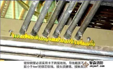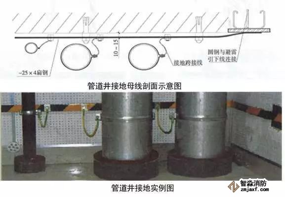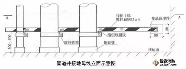 7、高層建筑管道頂部和底部接地:有接地預(yù)埋鋼板或垂直接地母線上引接接地母線,接地母線距地300~500mm,距墻10~15mm,并間隔100mm刷45°斜向黃綠相間油漆。將于管徑相匹配的接地抱箍安裝于管道上,抱箍必須與金屬體緊密接觸,編織軟銅線一端與抱箍連接,另一端與接地母線連接,螺栓連接處應(yīng)加平墊片和彈簧墊片。DN≥100mm時(shí),采用10mm²編織軟銅線,DN≤80mm時(shí),采用4mm²編織軟銅線。