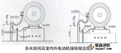 1、電源配管連接:根據(jù)電動(dòng)機(jī)接線盒位置敷設(shè)電源管,成排電動(dòng)機(jī)接線盒宜同向排列。電源敷設(shè)在靠近接線盒的方向,管口離地高度宜≥300mm,低于電動(dòng)機(jī)接線盒中心100~200mm,室外電源管高度與接線盒中心一致,管口安裝防水彎頭。在距管口50~100mm處焊接接地螺栓。軟管管徑應(yīng)與電源管同徑,軟管應(yīng)留有適當(dāng)余量,兩端采用專用管接頭盒專用盒接頭連接。導(dǎo)線壓倒接線盒內(nèi)的接線端子上。電動(dòng)機(jī)底座、電源管應(yīng)與接地母線可靠連接。