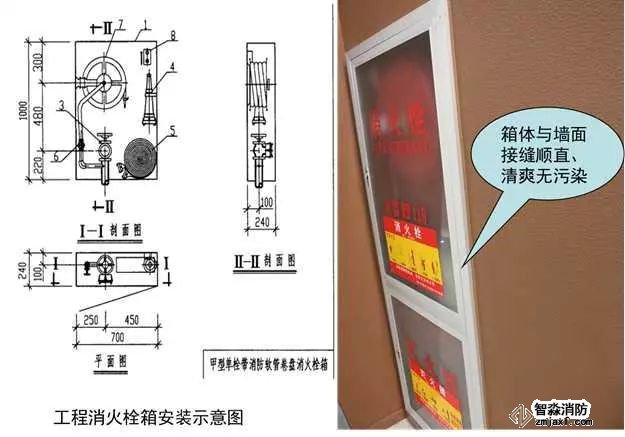 質(zhì)量控制要點(diǎn):開(kāi)門(mén)見(jiàn)栓、見(jiàn)鈕,栓口安裝高度1.1m允許偏差±20mm,閥門(mén)中心距箱側(cè)面為140mm(250mm)允許偏差±5mm,箱體安裝的垂直度允許偏差為3mm,箱門(mén)開(kāi)啟角度不應(yīng)小于160°,標(biāo)識(shí)醒目。