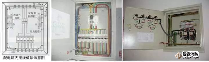 4、箱(柜)內(nèi)接線:先將線(纜)理順,按照100~200mm的間距用尼龍?jiān)鷰нM(jìn)行綁扎,拐角兩側(cè)30~50mm及分支處應(yīng)設(shè)扎帶,按照黃色(L1)、綠色(L2)、紅色(L3)、淡藍(lán)色(N)、黃綠相間色(PE)分別接入A相、B相、C相、N線、PE線端子上,多股線應(yīng)壓接線端子;標(biāo)識(shí):應(yīng)在N、PE端子排附近刻寫(xiě)或粘貼“N"、“PE”標(biāo)識(shí),進(jìn)入配電盤(pán)的外部回路應(yīng)扎回路牌,進(jìn)入配電盤(pán)的控制線在導(dǎo)線套上號(hào)碼管;接地:配電箱(柜)的接地螺栓、箱門(mén)上的接地螺栓、電源進(jìn)線回路的PE線、配電箱饋出各個(gè)回路的PE線、與配電箱連接金屬導(dǎo)管均應(yīng)PE端子直接連接,導(dǎo)通良好。