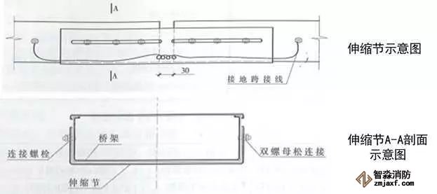 4、伸縮節(jié)安裝:當(dāng)橋架經(jīng)過(guò)建筑伸縮縫或橋架直線長(zhǎng)度大于30m(鋁合金及其他材料直線段長(zhǎng)度大于15m)時(shí),應(yīng)設(shè)置伸縮節(jié),伸縮節(jié)應(yīng)設(shè)置在伸縮縫位置或直線長(zhǎng)度的中間。伸縮節(jié)兩側(cè)各設(shè)置一個(gè)支架,支架與伸縮節(jié)端部距離不大于500mm。伸縮節(jié)補(bǔ)償收縮襯板應(yīng)設(shè)在伸縮節(jié)外側(cè),襯板螺栓孔應(yīng)開(kāi)成條形孔,襯板長(zhǎng)度為兩個(gè)連接板長(zhǎng)度之和加30mm,雙螺母應(yīng)位于橋架外側(cè),且不能擰緊,以保證自由伸縮。伸縮節(jié)兩端橋架應(yīng)采用軟銅線做接地跨接,接地線中間應(yīng)留有余量。
