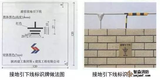 4、引下線標(biāo)識(shí):用厚度等于1mm的不銹鋼板加工制作標(biāo)識(shí)牌,具體要求見(jiàn)圖;用黃、綠油漆對(duì)引下線進(jìn)行相間標(biāo)識(shí),黃綠漆相間30~40mm;在引下線正下方距女兒墻頂面150mm處用云石膠粘貼標(biāo)識(shí)牌,位置明顯,便于觀察。