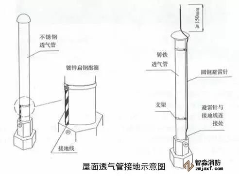 5、屋面金屬通氣管接地:采用鍍鋅扁鋼自屋面避雷網(wǎng)從透氣管根部引出,用抱箍沿透氣管固定,距根部或裝飾臺(tái)面間距300mm,根部與接地線連接,搭接長(zhǎng)度不小于100mm,透氣管的連接部位做接地跨接。