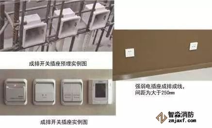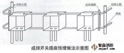 2、成排開(kāi)關(guān)插座盒安裝:根據(jù)結(jié)構(gòu)500mm線和結(jié)構(gòu)墻面線,確定成排線盒的高度及位置,墻內(nèi)主筋上做標(biāo)記,上下用兩根鋼筋穿接線盒,兩側(cè)加短鋼筋與結(jié)構(gòu)立筋焊接定位,盒口與模板面平齊,固定端正牢靠,間距均勻。