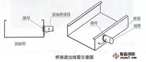 3、橋架進(jìn)出線管:根據(jù)出線口位置,在橋架側(cè)面開(kāi)孔,一管一孔。管端套5~6扣絲,與橋架連接內(nèi)外側(cè)采用鎖母固定,管口伸入橋架內(nèi)不大于5mm,導(dǎo)管與橋架采用不小于4mm²的軟銅線接地跨接。