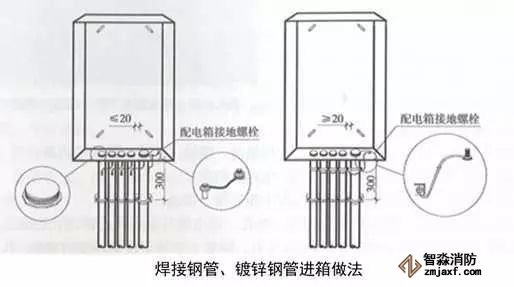 2、明配管進(jìn)箱處理:對(duì)于明配導(dǎo)管,距配電箱300處進(jìn)行固定;箱體采用開(kāi)孔器開(kāi)孔,孔徑與管徑相一致,開(kāi)孔間距均勻,邊沿間距不小于20mm;進(jìn)入箱體的導(dǎo)管端部套絲,采用鎖母固定,外露2~3扣絲;箱體與導(dǎo)管之間、箱體與裝設(shè)電氣部件的門(mén)之間采用編織軟銅線進(jìn)行接地連接,編織軟銅線兩端壓接接線端子。