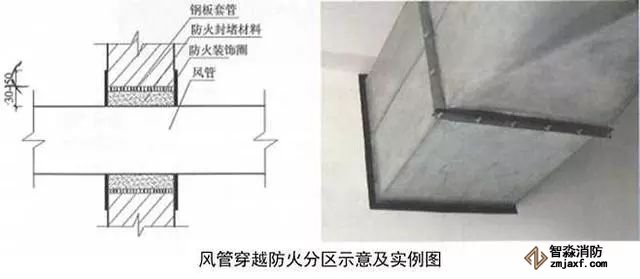 2、風(fēng)管穿越防火分區(qū)做法:用2mm厚鋼板加工制作風(fēng)管套管,套管接縫應(yīng)滿焊,套管尺寸比風(fēng)管四周尺寸大30~50mm,套管長(zhǎng)度與墻面厚度一致。安裝完后用防火材料將套管與風(fēng)管間隙填塞密實(shí)。用2mm厚、30~50mm寬黑色橡膠裝飾圈收口,裝飾圈角部45°拼接。風(fēng)管穿越防火分區(qū)處必須設(shè)防火閥,防火閥距墻分隔墻間距不大于200mm,風(fēng)管長(zhǎng)邊大于630mm時(shí),宜在防火閥兩側(cè)設(shè)單支吊架。