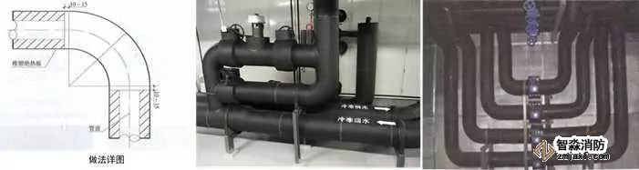 2、保溫管道穿墻處理:保溫管道穿墻、板時(shí),保溫層應(yīng)連續(xù)。應(yīng)采用橡塑保溫管(板)進(jìn)行穿墻、穿樓板保溫,用橡塑專用膠粘接牢固,接縫嚴(yán)密,兩端與墻面平齊,對(duì)接嚴(yán)密平整,兩側(cè)加牢固規(guī)整裝飾圈保護(hù)。保溫管(板)與墻、板面根部應(yīng)粘貼裝飾圈,接縫應(yīng)放在頂部或正視不明顯處,裝飾圈寬度20~50mm。