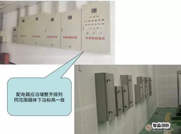 2)配電箱應(yīng)沿墻整齊排列,同范圍箱體下沿標(biāo)高一致。箱體高度600mm以內(nèi),底邊距地1.5m;箱體高度600~800mm,底邊距地1.2m;箱體高度800~1000mm,底邊距地1.0m;箱體高度1000~1200mm,底邊距地0.8m;箱體高度1200mm以上落地安裝;預(yù)空間滿足安全距離及檢修空間要求;