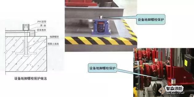 2、設(shè)備地腳螺栓防水防腐保護(hù):對(duì)室外和多水房間安裝的設(shè)備地腳螺栓,根據(jù)設(shè)備地腳螺母大小及螺栓外露長(zhǎng)度確定套管的直徑及高度,成排或同一區(qū)域內(nèi)螺栓外露長(zhǎng)度應(yīng)一致,以確保套管高度一致且覆蓋螺栓頂面5mm。套管直徑與螺母直徑匹配,套管安裝后用黃油填塞套管與螺栓之間的間隙,上口與套管平齊。