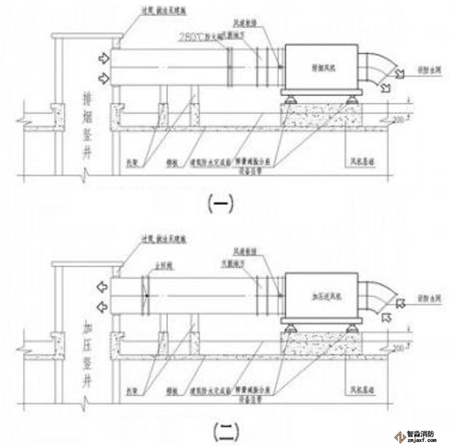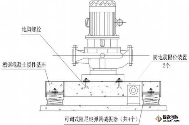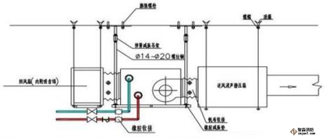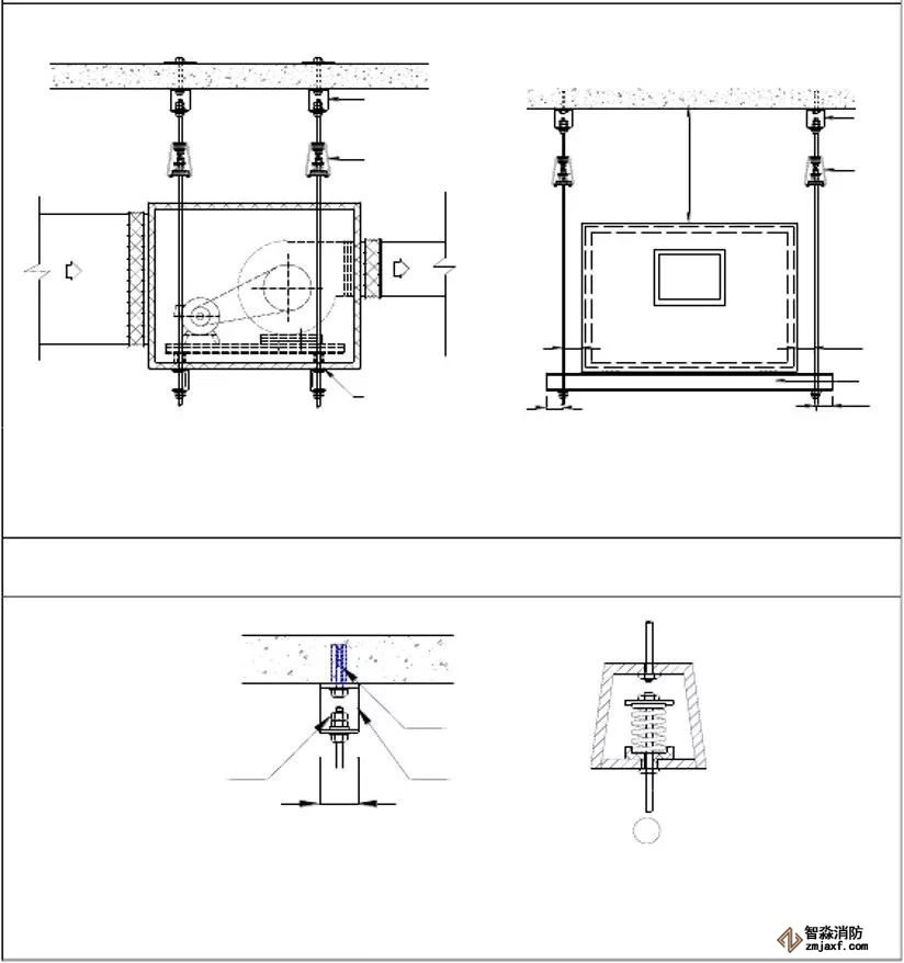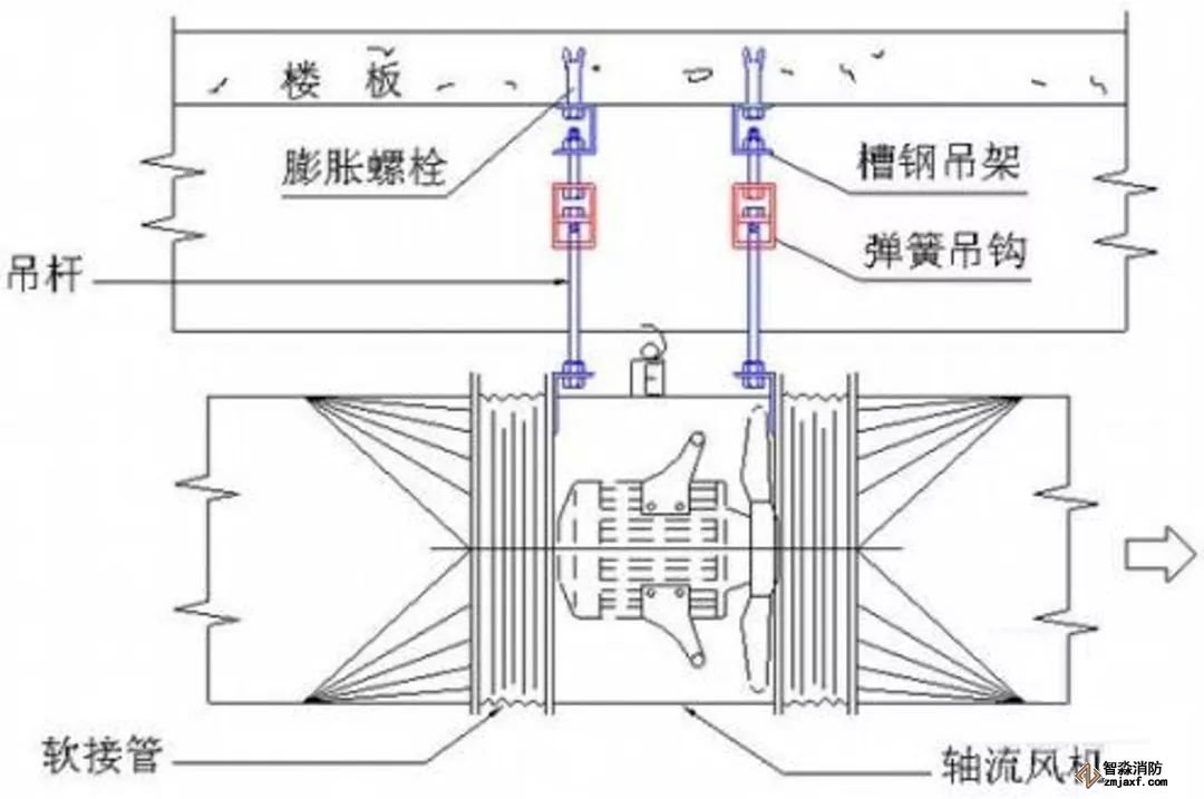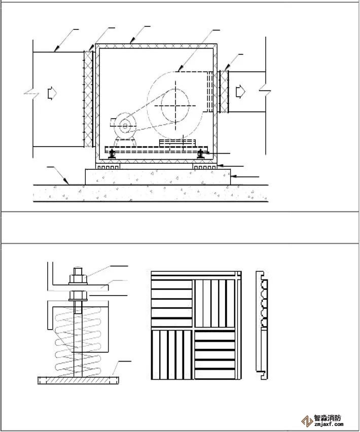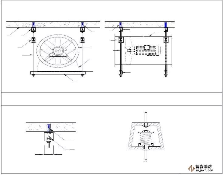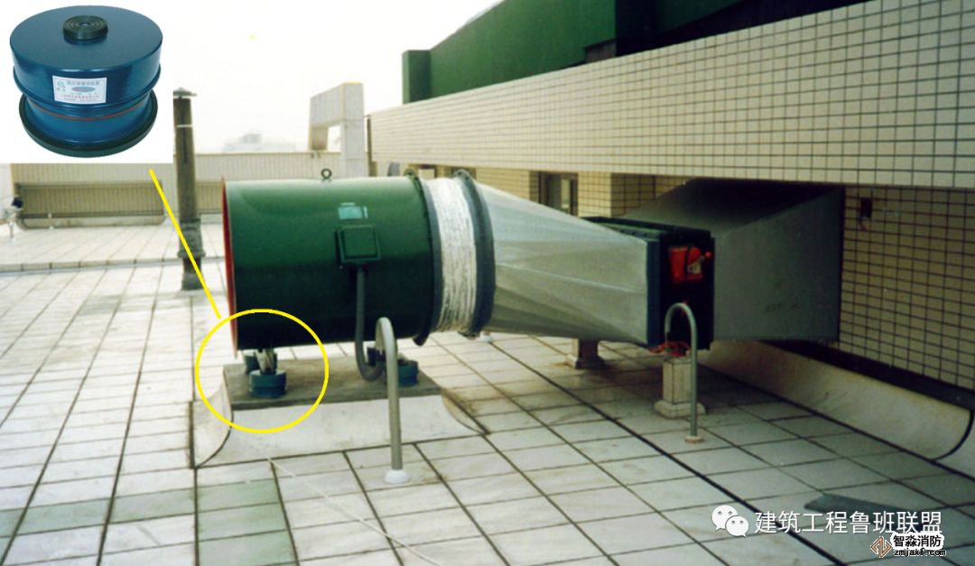 為防止軸流風(fēng)機(jī)工作時(shí)擺動(dòng),用槽鋼做成框架固定在樓板上,圖為排風(fēng)兼排煙風(fēng)機(jī)下部設(shè)置阻尼彈簧減震器