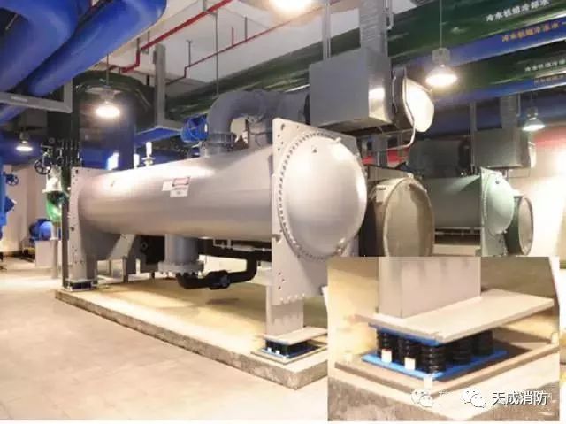 在彈簧減震器下部設置水平度調整鋼板,便于設備一次就位 。機組找平可根據(jù)設備的具體外型選定測量基準面,用水平儀測量,擰住地板上的螺栓進行調整,機組縱向、橫向的水平偏差均不大于1/1000。