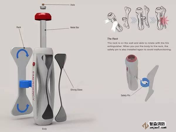 設計師Sheng-HungLee&Chen-HuaWang研究了需要滅火的各種情形,指出并不是所有的情況都適合用二氧化碳,于是設計了一款可以讓人瞬間在水和二氧化碳之間進行選擇轉(zhuǎn)化的混合滅火器,適用于各種狀況。