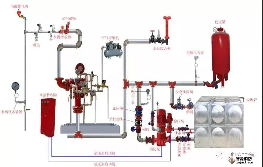 預作用系統(tǒng)在準工作狀態(tài)時配水管道內不充水,由火災自動報警器自動開啟預作用閥后,轉換為濕式系統(tǒng),預作用系統(tǒng)由閉式噴頭、預作用閥組、充氣設備(不是必須有)、水流報警裝置、供水設施及供水配水管道等組成。