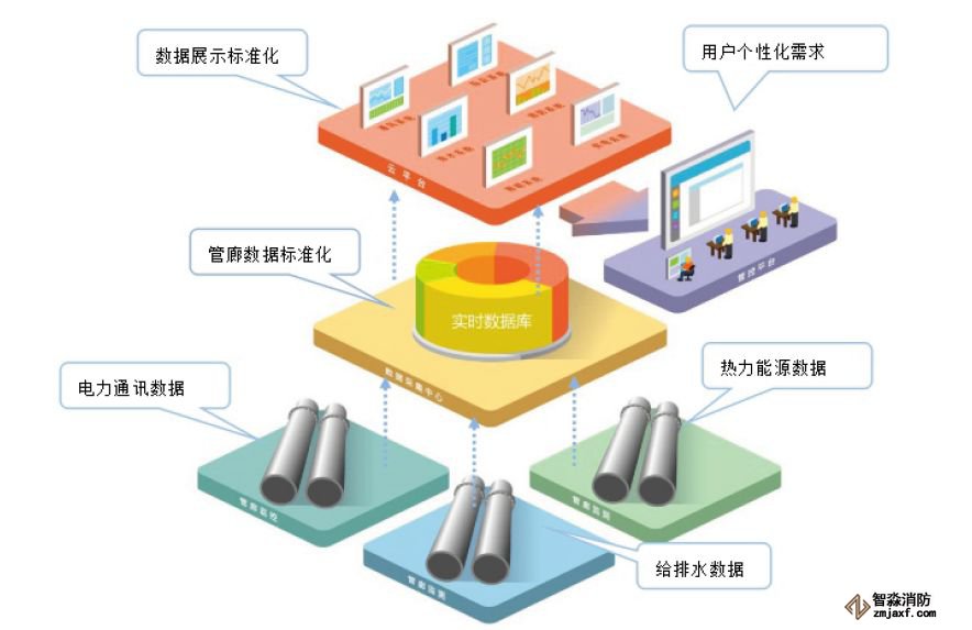 綜合管廊要實現(xiàn)系統(tǒng)的安全、穩(wěn)定運行,必須要從感知層、傳輸層、處理層、應(yīng)用層實現(xiàn)對供電、消防、照明、 通風、排水等系統(tǒng)的“集中管理”: