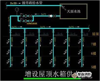 當市政管網(wǎng)的供水壓力夠大(能夠到達最高樓層)但是管徑偏?。ㄐ∮贒e50)時,則可在樓頂增設屋頂冷水箱,市政管網(wǎng)接入屋頂冷水箱進行蓄水,在供水的主管道上安裝增壓水泵和變頻控制器,壓力控制以滿足最高樓層的供水壓力不小0.15MPa為準。