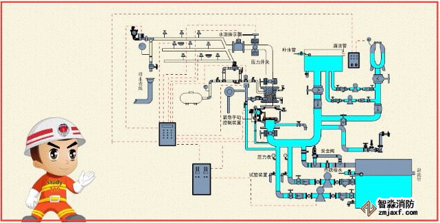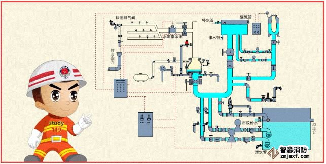 配置供給泡沫混合液的設(shè)備后,組成既可噴水又可以噴泡沫的自動(dòng)噴水-泡沫聯(lián)用系統(tǒng)。