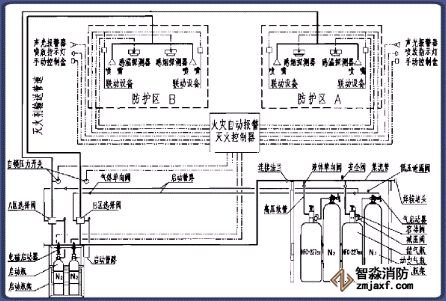 該系統(tǒng)由滅火劑儲(chǔ)存裝置、總控閥、驅(qū)動(dòng)器、噴頭、管道超壓泄放裝置、信號(hào)反饋裝置、控制器等組成。