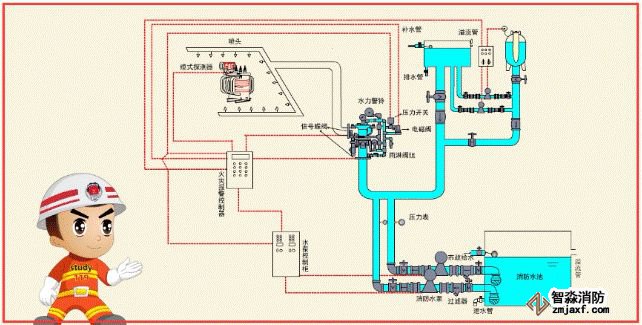 預(yù)作用系統(tǒng)與濕式系統(tǒng)、干式系統(tǒng)的不同之處,在于系統(tǒng)采用雨淋閥,并配套設(shè)置火災(zāi)自動(dòng)報(bào)警系統(tǒng)。