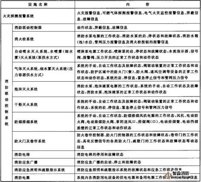 2、消防控制室內(nèi)設置的消防設備應能監(jiān)控并顯示建筑消防設施運行狀態(tài)信息,并應具有向城市消防遠程監(jiān)控中心(以下簡稱監(jiān)控中心)傳輸這些信息的功能。建筑消防設施運行狀態(tài)信息見下表1。