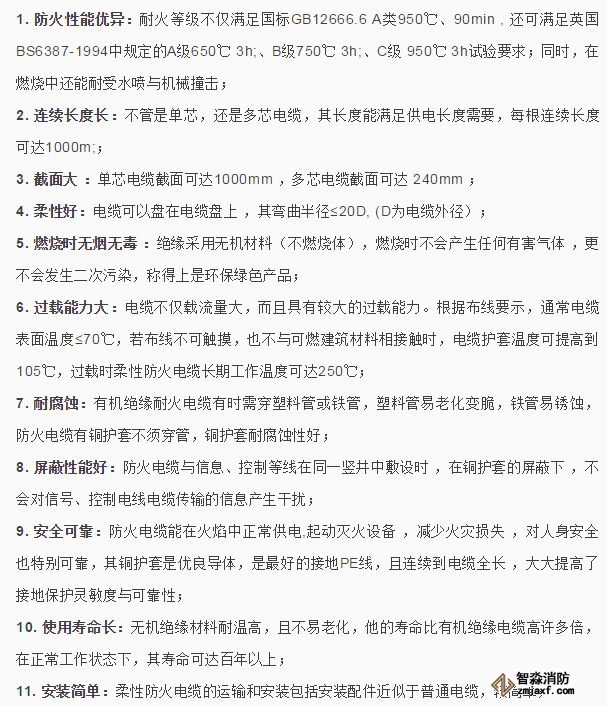 12. 安裝費(fèi)用低:柔性防火電纜由于制作工藝先進(jìn),安裝簡(jiǎn)單,在同等條件下其綜合費(fèi)用比礦物絕緣電纜的費(fèi)用明顯降低。