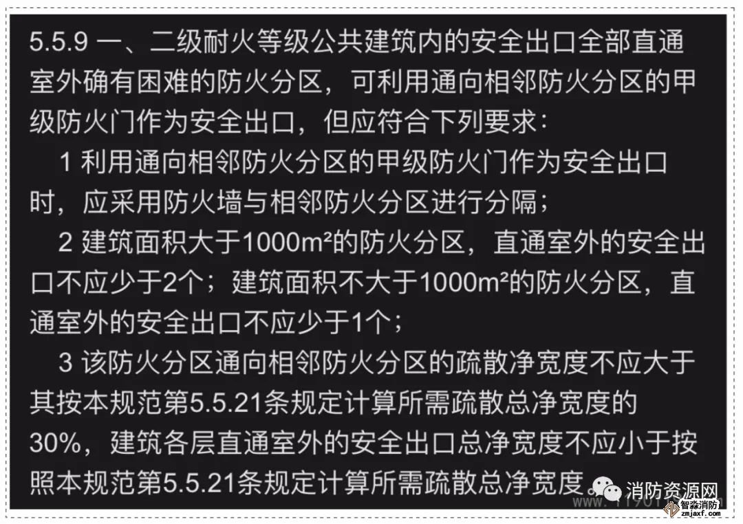 1、耐火等級為一級或二級的公共建筑,相鄰布置的防火分區(qū),如某防火分區(qū)的安全出口全部直通室外確有困難,可利用防火墻上通向相鄰防火分區(qū)的甲級防火門,作為安全出口,詳見《建規(guī)》5.5.9
