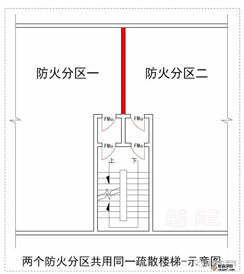 3.3 三個及以上防火分區(qū)不得共用同一部疏散樓梯。兩個防火分區(qū)共用疏散樓梯時應分別設置前室,并應符合防煙樓梯間的設置要求,開向前室的門應為甲級防火門。