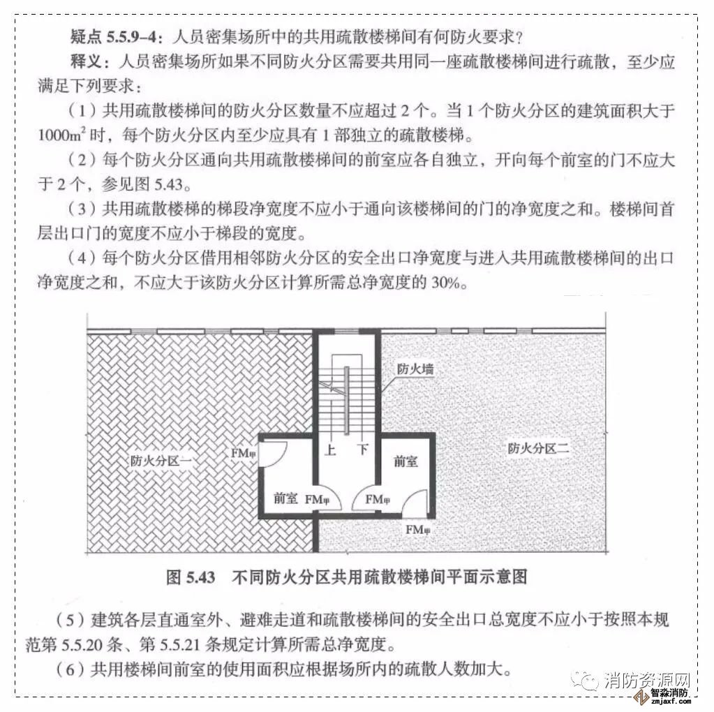 附錄2:“《建筑設計防火規(guī)范》GB50016-2014(2018年版)實施指南”關于人員密集場所中的共用疏散樓梯間的防火要求: