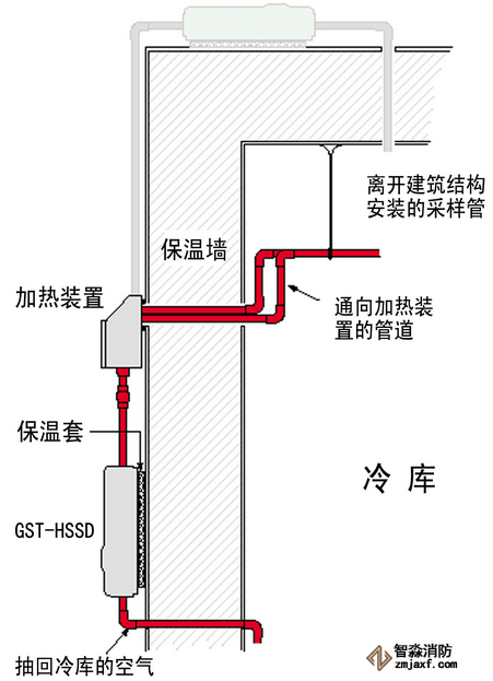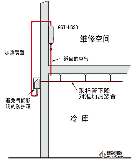 冷庫中采樣管,加熱箱和吸氣式感煙火災(zāi)探測(cè)器的相對(duì)位置