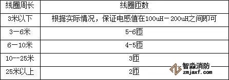 為了使檢測器工作在最佳狀態(tài)下,線圈的電感量應(yīng)保持在100uH-300uH之間。在線圈電感不變的情況下,線圈的匝數(shù)與周長有著重要關(guān)系。周長越小,匝數(shù)就越多。一般可參照下表:
