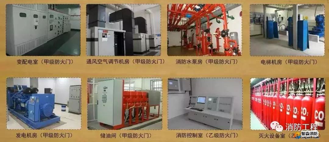 重要設備間需要設置防火門,以保護設備安全,常用的設備間有:變配電室(甲級)、通風空氣調節(jié)機房(甲級)、消防水泵房(甲級)、電梯機房(甲級)、發(fā)電機房(甲級)、儲油間(甲級)、消防控制室(乙級)、滅火設備室(乙級)。