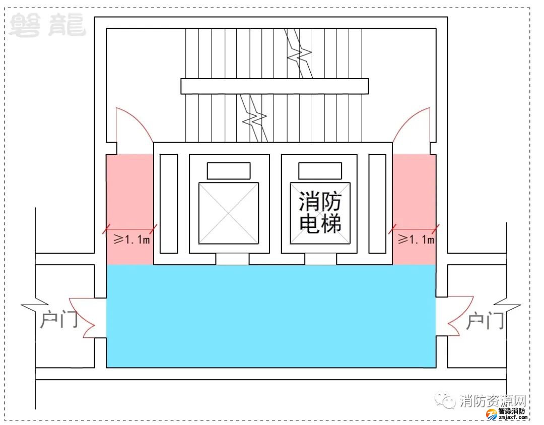前室應(yīng)該是相對(duì)規(guī)則的區(qū)域,特殊情況下,可以有不規(guī)則的擴(kuò)展部分,但應(yīng)確保消防電梯前室規(guī)則區(qū)域的尺寸及面積要求,有疏散功能的通道,其凈寬度應(yīng)計(jì)算確定,并不應(yīng)小于對(duì)應(yīng)建筑內(nèi)疏散走道的最小凈寬度要求。